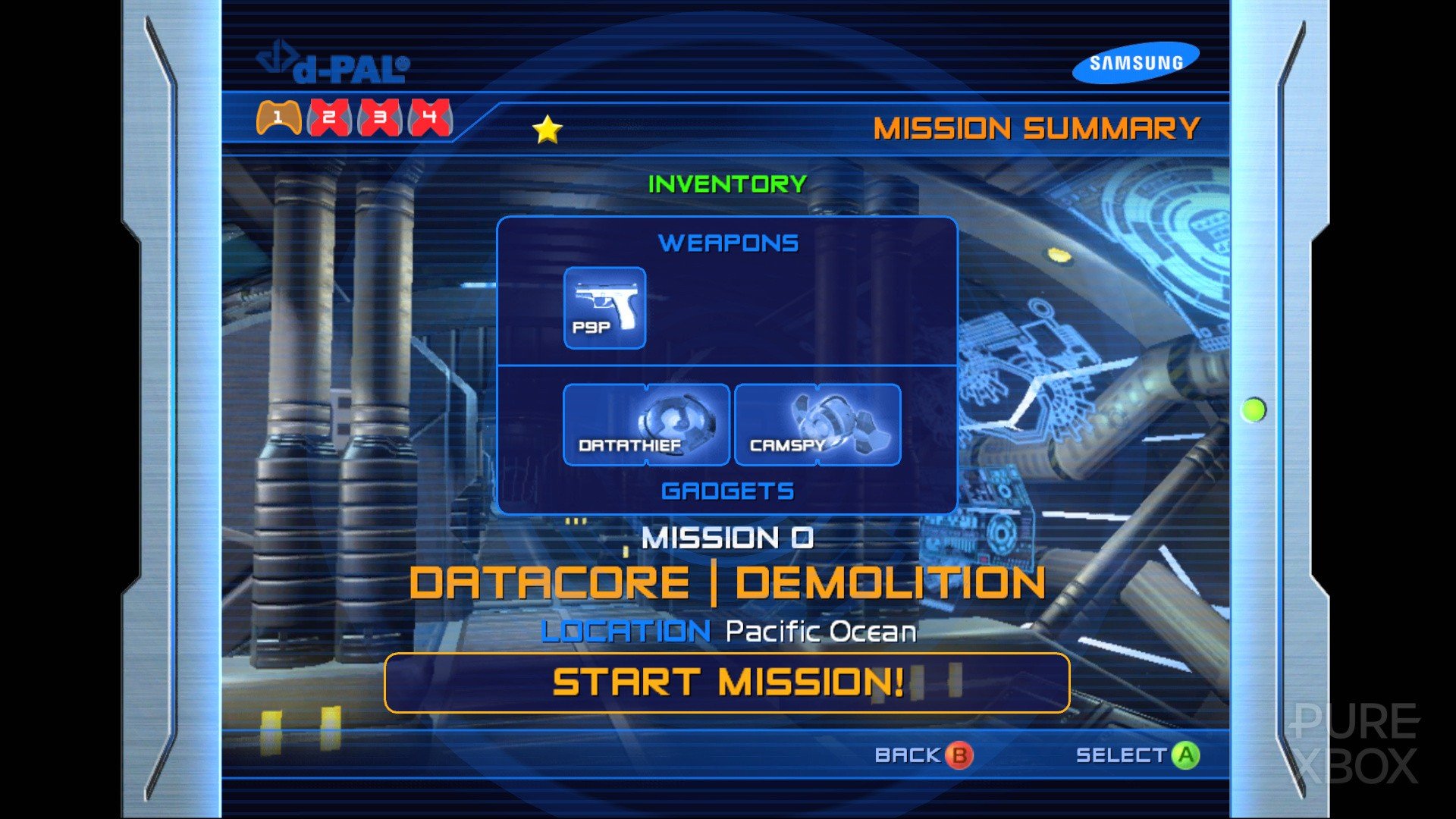 One thing I must mention about Perfect Dark Zero is that it’s definitely a time capsule of those early Xbox 360 days. There’s a James Bond-like introduction that seems to desperately try to entice the MTV generation (think Die Another Day), and a menu interface complete with flashy 2000s presentation featuring an old-school Samsung logo in the upper corner. You can easily see how this merged with the classic Xbox 360 “Blades” dashboard at that time.